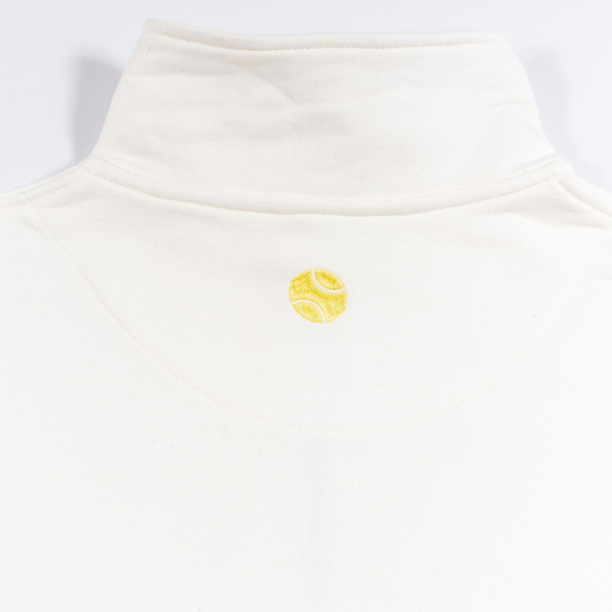 Embroidered with HAPPIEST ON THE COURT® on the left sleeve and a signature tennis ball on the back, it’s a timeless blend of sporty elegance and playful charm. With its easy, loose silhouette, this tennis quarter zip layers perfectly over your tennis dress or pairs beautifully with leggings or skirts for off-court days.