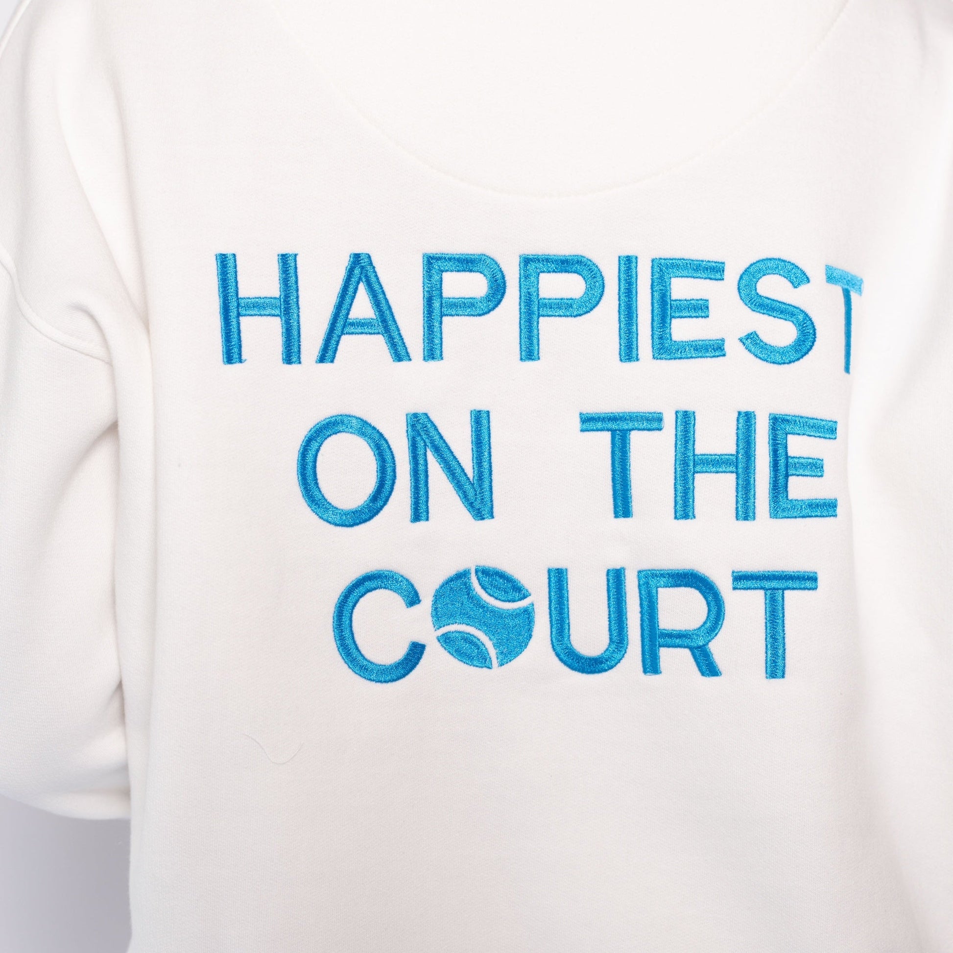The back is embroidered with HAPPIEST ON THE COURT—a joyful reminder of where you truly belong. Its easy, loose silhouette makes it perfect for layering over your tennis whites or pairing with jeans for off-court days.