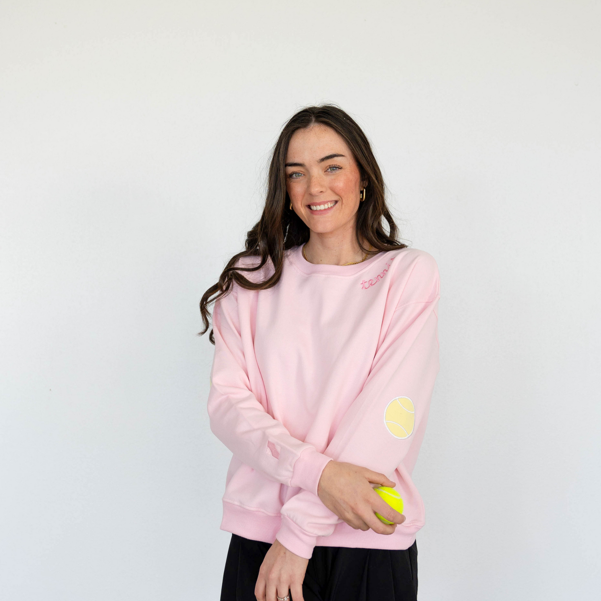 Add a playful twist to your court-to-casual wardrobe with the CourtLife Tennis Patches Sweatshirt, made from a luxuriously soft Peruvian cotton blend. This women’s tennis sweatshirt features tennis delicately embroidered along the neckline and bright yellow tennis ball patches on the elbows for a fun, sporty finish.